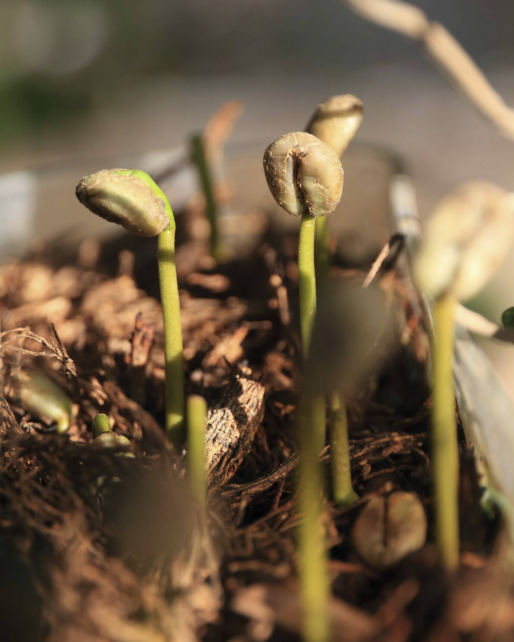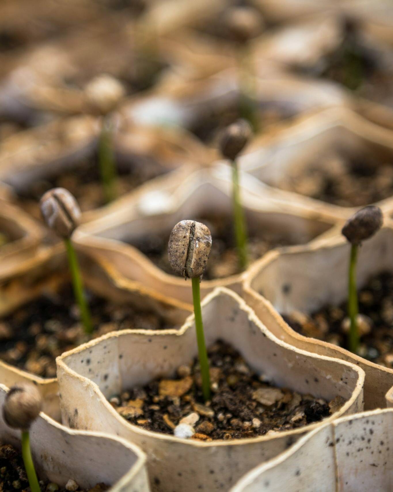 Au bout de 10 semaines environ, les jeunes pousses de café germent. Une fois qu’elles ont atteint une hauteur de 5 à 10 cm, elles sont plantées dans de grands pots ou dans des sacs en plastique et transférées dans des pépinières.